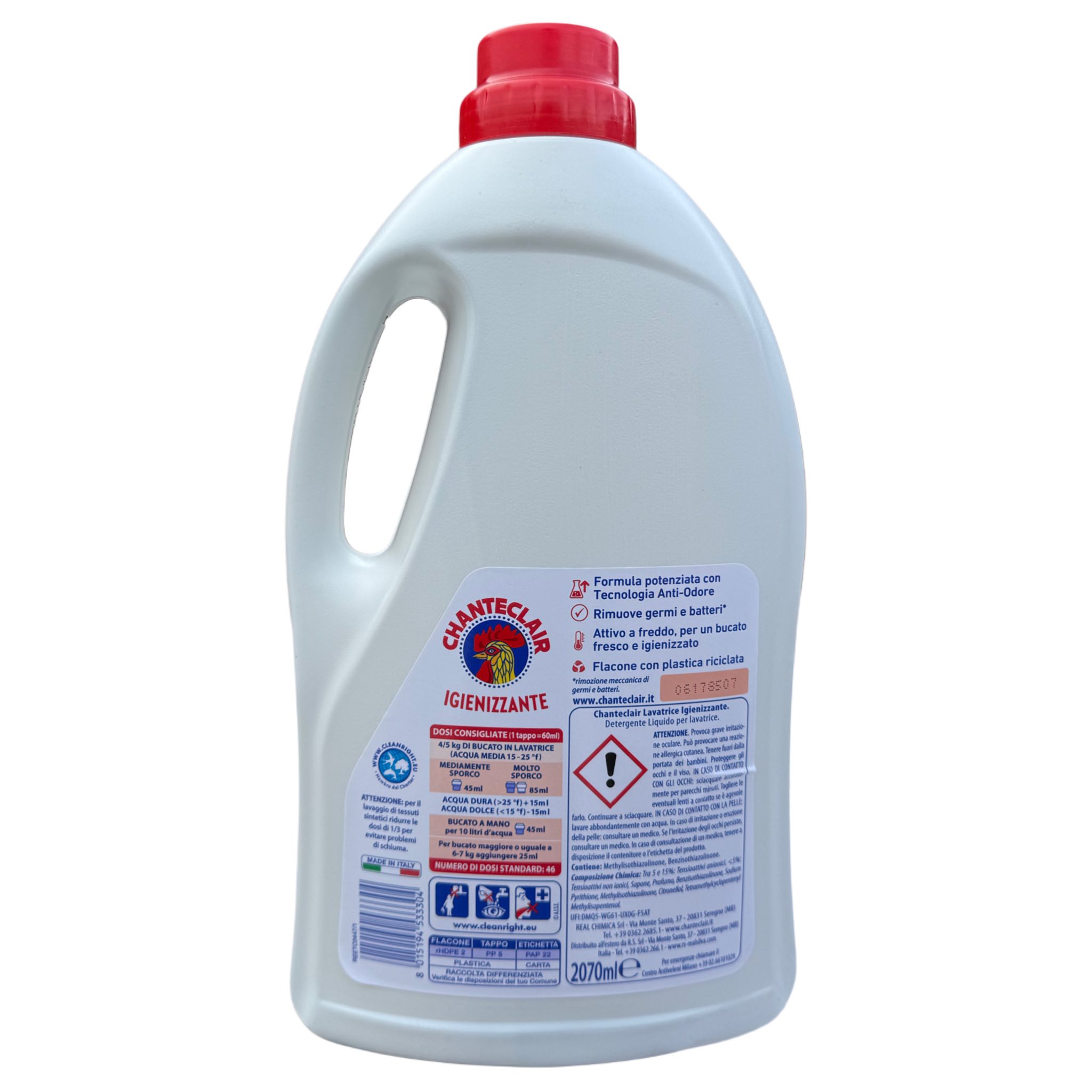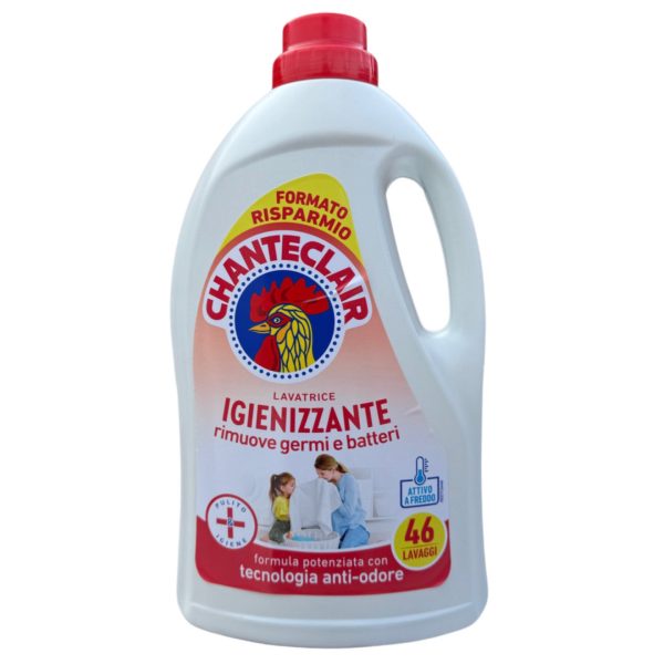 Chanteclair Igienizzante — це ефективний рідкий засіб для прання з антибактеріальною формулою, який ретельно очищає тканини, усуває мікроби та неприємні запахи, забезпечуючи гігієнічну чистоту білизни навіть при низьких температурах.